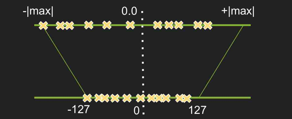 图中黄色部分被舍弃掉了,它们将直接被量化为 -127