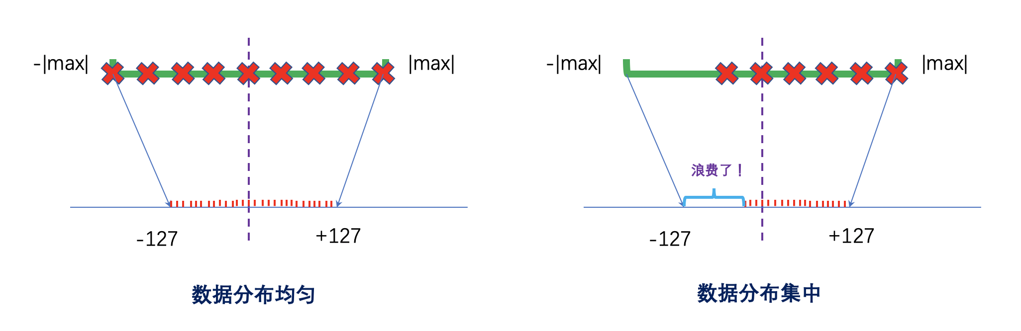 我们发现,量化的过程与数据的分布有关。如下图所示:当数据的直方图分布比较均匀时,高精度向低精度进行映射就会将刻度利用比较充分;如果分布不均匀,就会浪费很大空间。通俗地来讲,就会出现很多数字挤在一个刻度里:比如 scale=23.456 时,6.1817 和 6.1823 都表示成了 145。