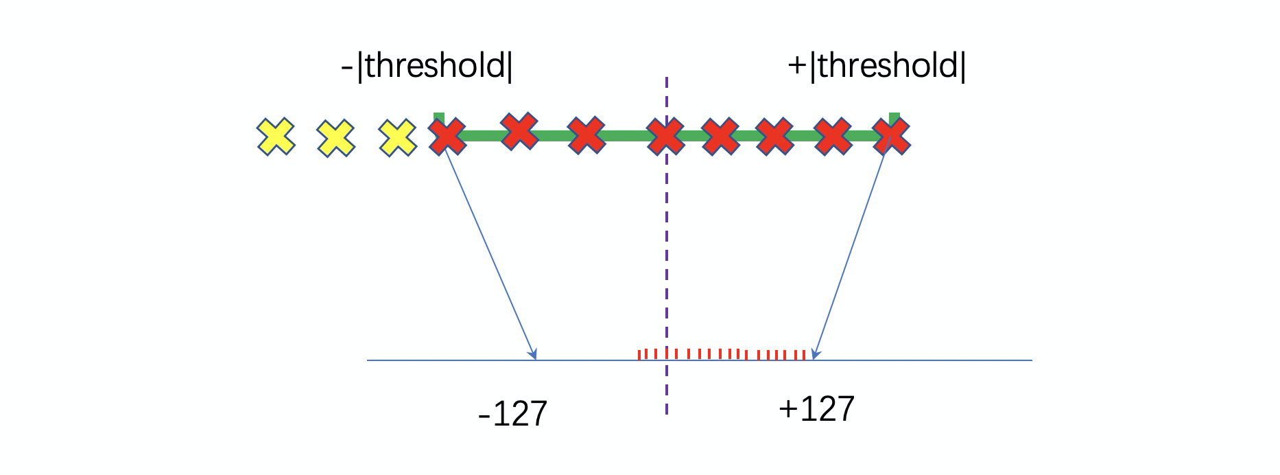 关于上面这种直接将量化阈值设置为 |max| 的方法,它的显著特点是低精度的 int8 空间没有充分利用,因此称为不饱和量化(no saturation quantization)。针对这种情况,我们可以选择一个合适的量化阈值(threshold),舍弃那些超出范围的数进行量化,这种量化方式充分利用了低精度空间,因此称为饱和量化(saturation quantization)。
