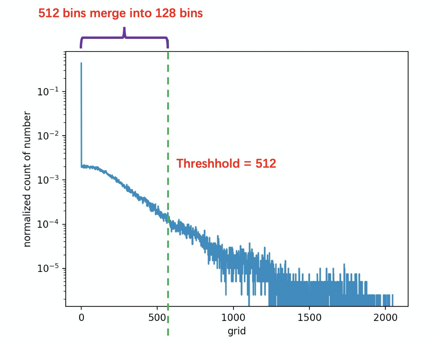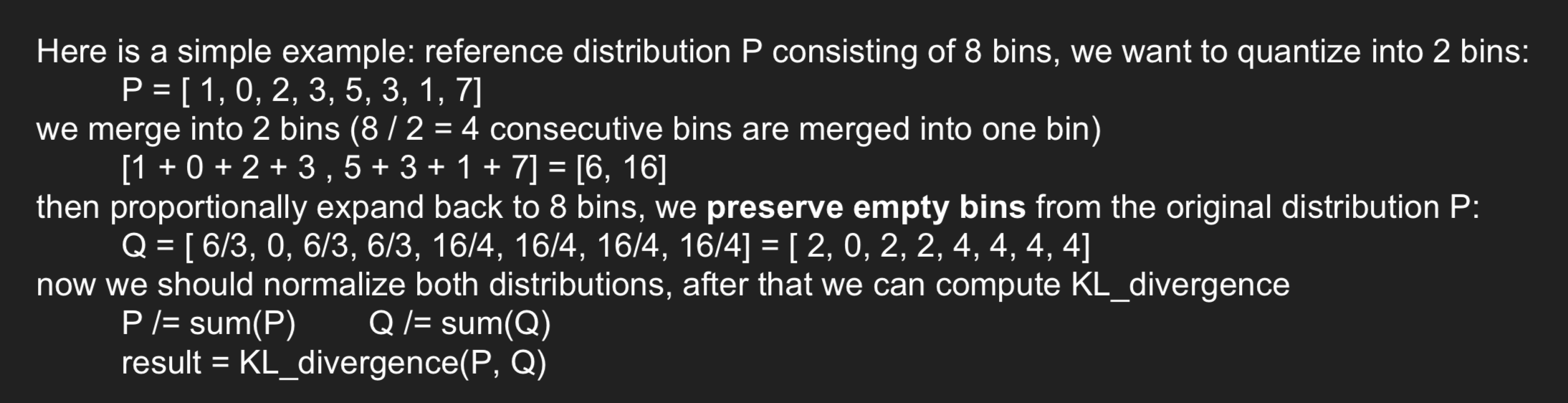 假如我们设定阈值刻度 Threshold=512,因此需要将 512 个刻度合并成 128 个刻度(因为 int8 的正数范围为 0~127,一共 128 个刻度)。假设合并前 (0,512) 的分布为 P, 合并成 (0, 127) 后的分布为 Q。那么我们肯定要计算这两个分布的差异性,并希望它们之间的差异越小越好。